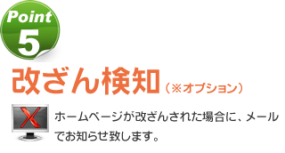 急増するホームページの改ざん、ホームページの規模の大きさに関係なく、無差別的に狙われてしまいます。定期チェックにて意図しないホームページの改ざんに気づくことができます。また、改ざんチェックだけではなく、ホームページ更新後のリンク切れチェックなどにもご活用いただけます。